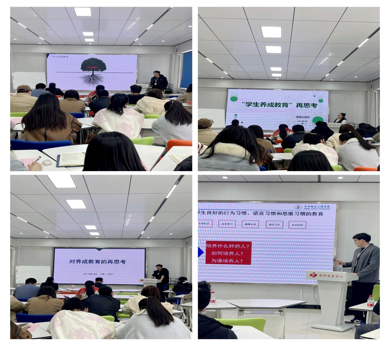 王丽伟老师对学生养成教育如何结合学校特色,不断完善并形成成果,以及第二课堂如何在现有基础上做出特色,打造品牌,提升育人成效方面进行分享;刘贤鹏老师对立德树人的角度分析学生养成教育的内涵建设及学生养成教育如何在现有基础上进行完善进行讲解;于海龙老师就如何以“双养工程”为抓手将育人体系联系起来,形成特色在品牌活动体现进行阐述;米新老师对教师养德修为与生涯导师活动如何有效融合及第二课堂如何在现有基础上做出特色、形成成效方面进行讲解;薛苗苗老师对第二课堂建设方面进行分享;刘铭炜老师对培养学生良好的行为习惯、语言习惯和思维习惯的教育及如何助力学生成长成才方面进行分享。