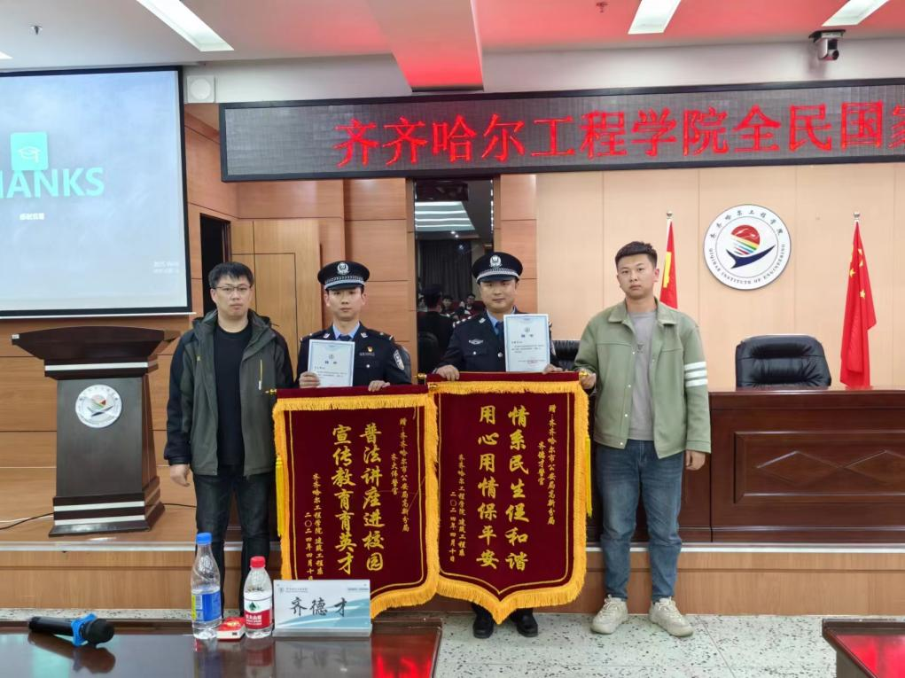 建筑工程系党总支副书记刘贤鹏和学校机关工会主席、建筑工程系生涯导师隽永刚为两位警官颁发了聘书,并授予锦旗。