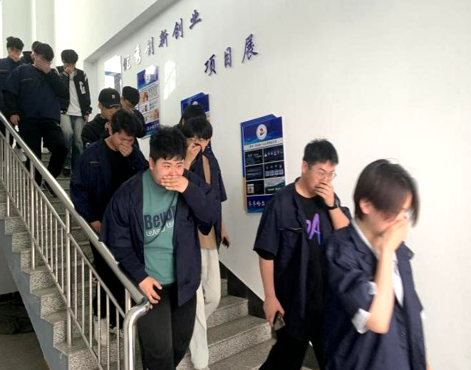 随着火情信号发出,演练正式开始。听到警报后楼内各疏散口、楼梯口等重点区域的引导员迅速就位,引导学生遮住口鼻,保持弯腰,沿疏散标识所示方向迅速、有序撤离至楼外安全地带,圆满完成演练全过程