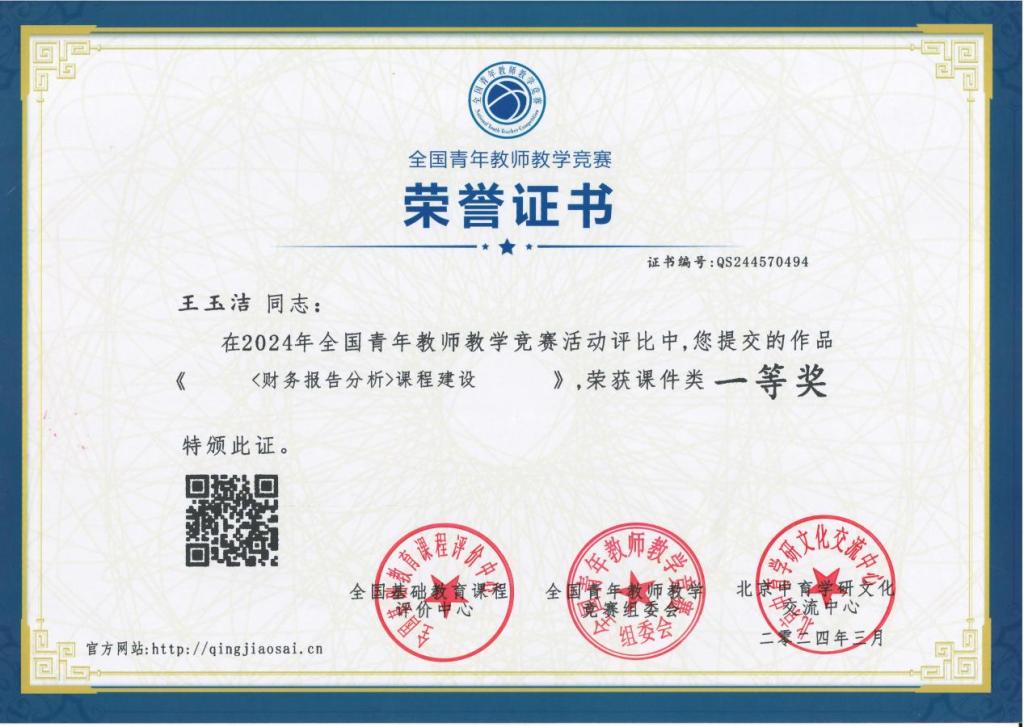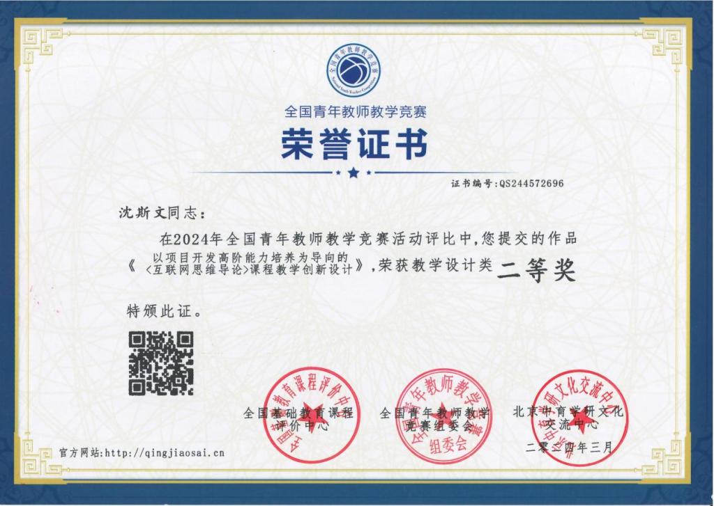 近日,2024年全国青年教师教学竞赛组委会传来喜讯管理工程系互联网金融专业沈斯文老师荣获课件类一等奖教学设计类二等奖,王玉洁老师荣获课件类一等奖。