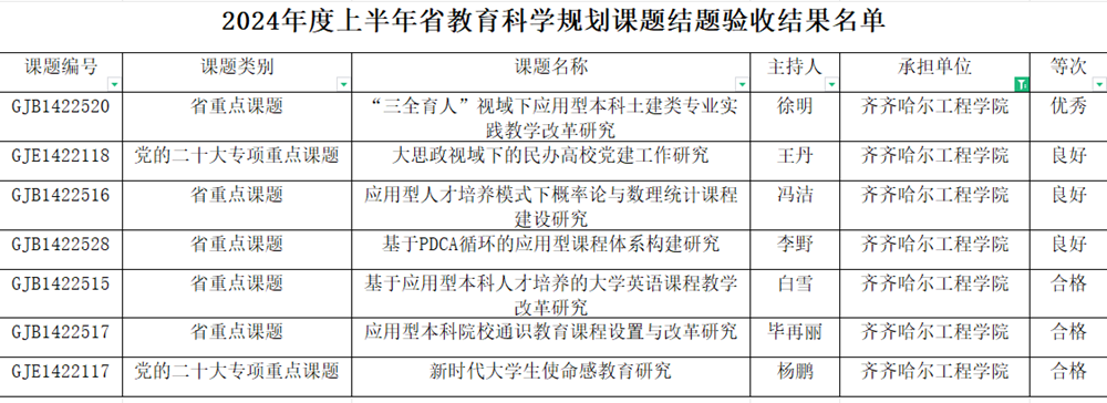 近日,黑龙江省教育科学规划领导小组办公室下发通知公布上半年课题结题验收结果,学校教工主持的7项省教育科学规划重点课题顺利通过结题验收,结题通过率100%。其中,徐明老师主持的课题获得优秀,王丹、冯洁、李野三位老师的课题获得良好,此次课题结题优良率达57%。