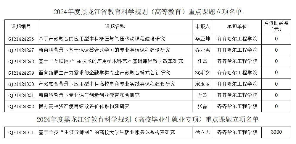 日前,黑龙江省教育科学规划领导小组下发《关于确定2024年度省教育科学规划课题立项名单的通知》(黑教科规〔2024〕1号)公布课题立项结果,开云官网组织申报的8项省级重点课题获批立项(包括高等教育类7项,毕业生就业专项1项)。其中,毕业生就业专项重点课题全省仅批准30项,只有10项获得省经费支持,开云官网徐立志老师的课题位列其中并获得3000元资助。