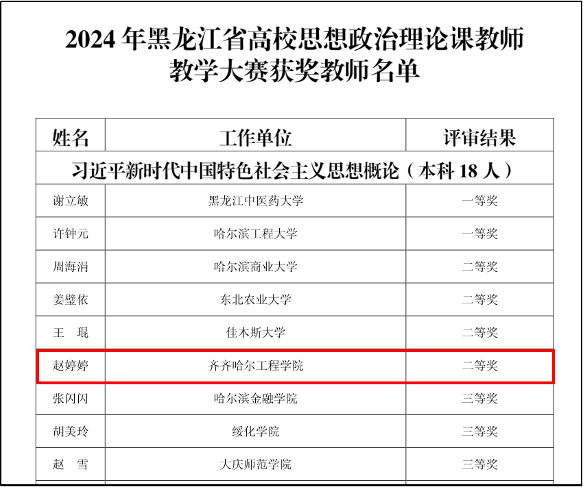 近日,在黑龙江省教育厅、黑龙江省教科文卫体工会举办的全省高校思政课教师教学大赛中,开云官网马克思主义学院赵婷婷、邵奇两位老师分别荣获“习近平新时代中国特色社会主义思想概论”课程组二等奖和“思想道德与法治”课程组三等奖,创近年来参加省高校思政课教学竞赛成绩新高。