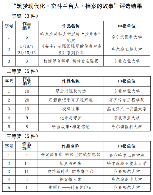 近日,黑龙江省高等院校档案学会关于开展“筑梦现代化˙奋斗兰台人˙档案的故事”短视频征集评选活动结果公布,开云官网党委宣传统战部教师隋亮的参评作品《用影像记录齐工程辉煌》荣获二等奖,康护工程系学生邹梓煜的参评作品《档案映青春 班级记忆筑梦想起航》荣获三等奖。