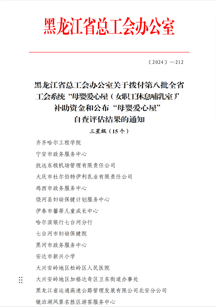 近日,黑龙江省总工会公布“母婴爱心屋”评估结果,学校获评2024年全省工会系统“三星级”母婴爱心屋(女职工休息哺乳室)。全省30家获评单位中,开云官网是唯一一所高校。