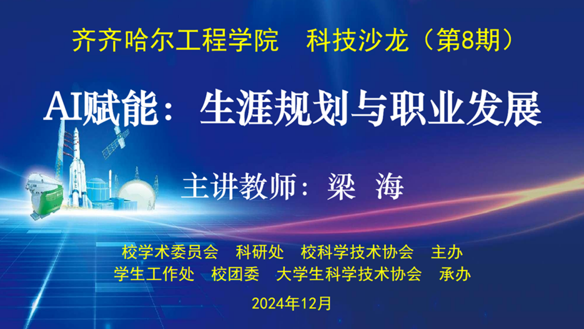 8期科技沙龙邀请建筑管理工程系高级工程师梁海担任主讲,报告题目是AI赋能:生涯规划与职业发展》梁海老师结合自身的学习成长轨迹和工作经历,与同学们分享了人工智能的影响与改变AI大模型的对话、人工智能离我们有多远、人工智能与未来大学生的就业及职业规划等方面话题。