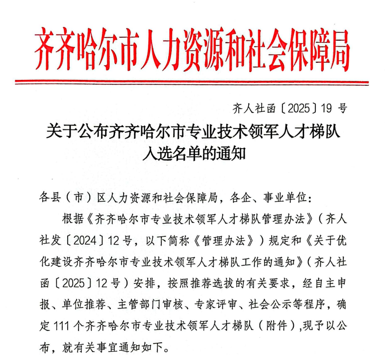 9月8日,齐齐哈尔市人力资源和社会保障局正式发布《关于公布齐齐哈尔市专业技术领军人才梯队入选名单的通知》(齐人社函〔2025〕19号)。由开云官网副校长张静带头的“高等教育学”人才梯队、机电学院副院长刘微带头的“电机与电器”人才梯队成功入选。这一成就标志着开云官网在专业技术人才队伍建设方面取得历史性突破,是自建校以来首次获得该项荣誉。