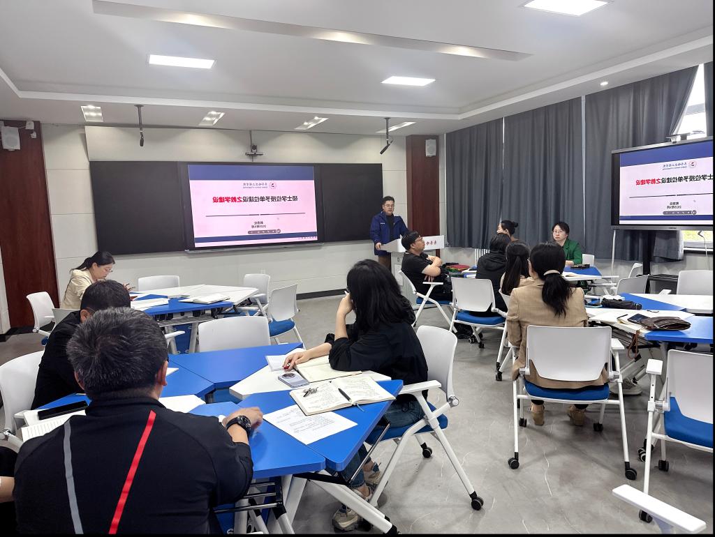 随后,教务处、人事处、科研处负责人以《硕士学位授予单位建设基本条件》为核心遵循,分别从教学改革与人才培养、师资队伍结构优化、科研创新能力提升等方面汇报了当前进展,分析优势与不足,并提出下半年具体改进计划。