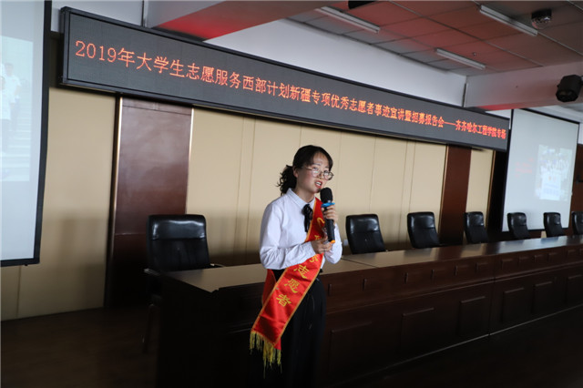 报告会由学院团委书记周伟主持。新疆维吾尔自治区阿勒泰团地委副书记李晓宇在会上对西部计划大学生志愿者招募条件、招募流程、服务方式、政策保障等有关事项进行宣讲,西部计划优秀志愿者张博轩、马玉娥、徐晓莹分别就自己投身西部计划,在疆志愿服务工作的经历和感悟做交流分享,鼓励大学生们到天山南北、戈壁绿洲,立足岗位、奉献进取,以实际行动和骄人业绩,践行“奉献、友爱、互助、进步”的志愿者精神。