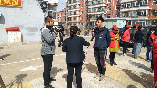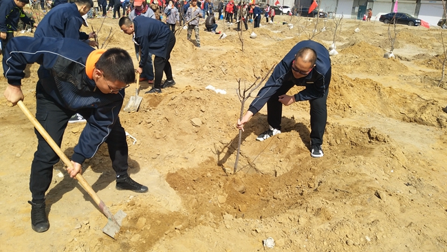 在鑫明园小区,白雪处长在划分给学院负责植树的区块插上标识牌,并与建筑系师生一起参加植树活动。大家热情高涨、干劲十足,在专业人员的指导下,两人一组,铲土、挖坑、栽苗、填土、浇水,共栽植了10棵沙果树、李子树。植树活动期间,土木152班张天浩同学还接受了市电视台记者采访。