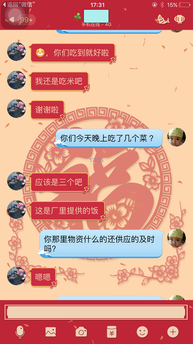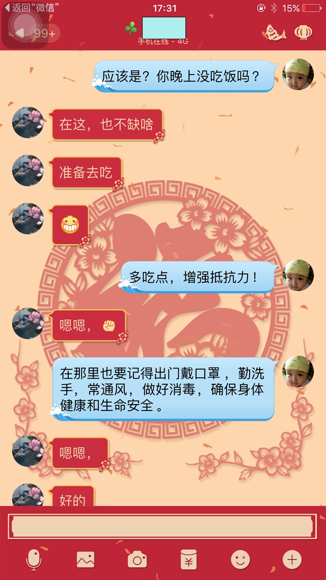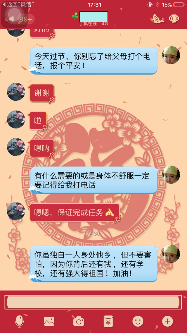 这名学生由于当地采取封城疫情防控措施,不能继续勤工俭学,每日待在住处,虽有所在工厂保障每日三餐,但自身还是难免感到有些焦虑。建筑工程系领导得知后,十分关注这名学生身心健康状况叮嘱辅导加强联系沟通,及时疏导和安抚。辅导员蔡爽坚持天通过QQ与这名学生沟通,为其讲解新冠肺炎防知识,并关心学生的经济和心理方面状况,让这名异乡的学生感受来自学辅导员老师的温暖,感自己并不孤单,增强了战胜疫情的信心。