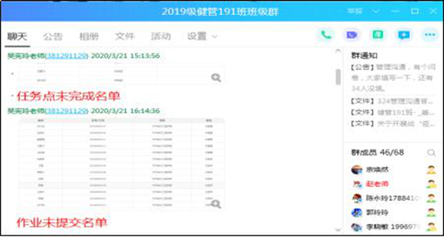 3、课下——学习通+qq监督指导。帮助学生养成良好学习习惯——学生习惯的养成需要一个从“他律”到“自律”的过程。线上学习,需要教师帮助学生从“他律”顺利过渡到“自律”。因此,我将学生分成14个组,以小组为单位进行学习,并采取组内互相监督的模式,每周五由组长汇报本组学生学习情况、学习任务完成情况,对未按规定时间完成学习内容的小组进行惩罚,以此督促学生,形成长效监督机制: