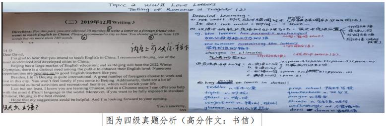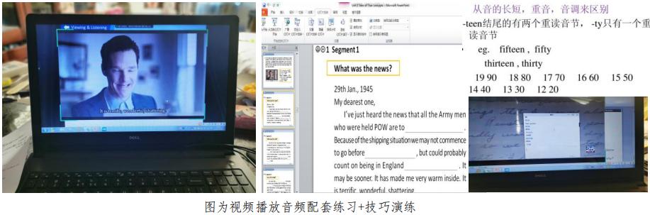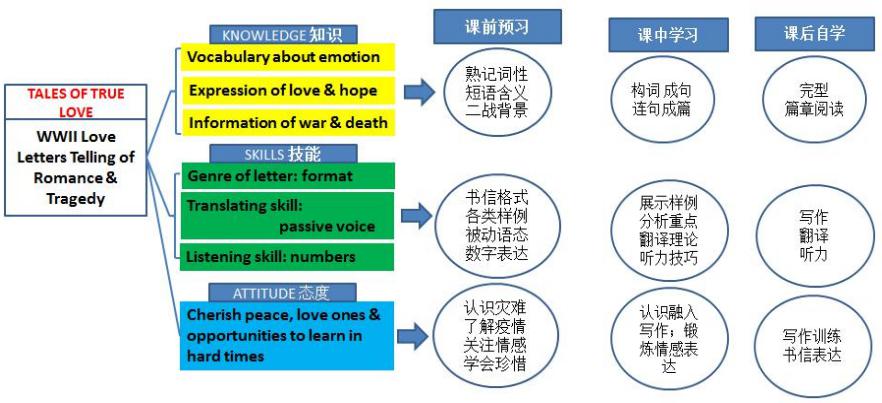 主题为“爱的故事”:二战情书。知识目标主要采用先学后教方式,由学生预习学会基础词、短语、句式的含义及形式变化;课内学习成句成篇的方法和灵活处理方式及应用背景,课后进行篇章背景下的阅读应用巩固;技能目标预习中以任务前置方式,由学生自查资料、学习短视频及课件内容,根据理解形成课内讲述汇报,课内通过翻转课堂形式分组汇报讲解并提出问题,教师在学生讲解基础上补充、提炼、再现技能点,加入补充训练进行课内强化;课后在 we learn 平台下达相关训练任务再次巩固所学。