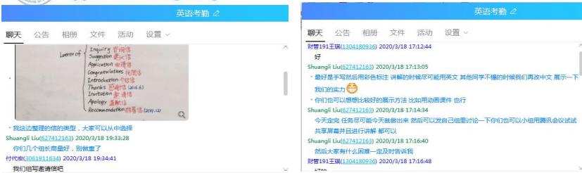 一是在线翻转、师生互动。让学生“讲”——课内学生以共享自己小组的作业并对作业进行英文讲解的方式,既做到让不同种类书信举例丰富多样,又用学生之间最熟悉的方式“教会”其他同学书信体的规范语言和内容。让学生“演”——学生用自己的方式表达课程思政内容——珍爱生命、珍惜机会。