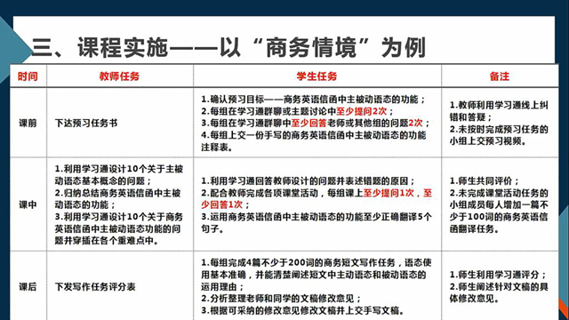 赵丹丹老师的《英语视听说IV》课程分享,其特点是:面向英语专业学生的职业领域,解构和重构课程内容,同时设计相应的学习产出内容;在课程实施方面,从视、听、说三个维度展开教学过程,以赛促学;注重过程性评价,为学生建立成果档案。