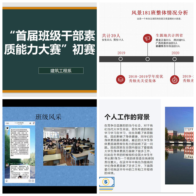 6月28日中午,建筑工程系在线举办“首届班级干部素质能力大赛”初赛,系学生工作副主任王丽萍和全体辅导员担任评委。参赛班干部精心制作PPT,围绕班级整体情况、个人工作情况、班级风采展示、未来工作构想四个方面展开演讲,表示将积极带领班级同学互帮互学,取得更大进步。评委老师对每名班干部的演讲随机提问,班干部分别结合平时工作中积累的体验做出回答,互动精彩纷呈。本次初赛选拔出4名优秀班干部代表建筑工程系参加学校组织的复赛。