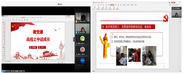 工程管理专业教师党支部组织开展微党课活动,6月29日,党支部书记张好徽为班级学生上“坚持和加强党的领导,打赢疫情防控阻击战”微党课,引导同学们认识到在中国共产党的坚强领导下,充分发挥中国特色社会主义制度优势,紧紧依靠人民群众,我们一定能打赢这场疫情防控阻击战。中国制度、治理能力以及中国人民的素质在这场罕见的疫情考验面前,必将得到锤炼和升华。党支部其他党员教师也分别结合课程教学,为学生们上微党课。