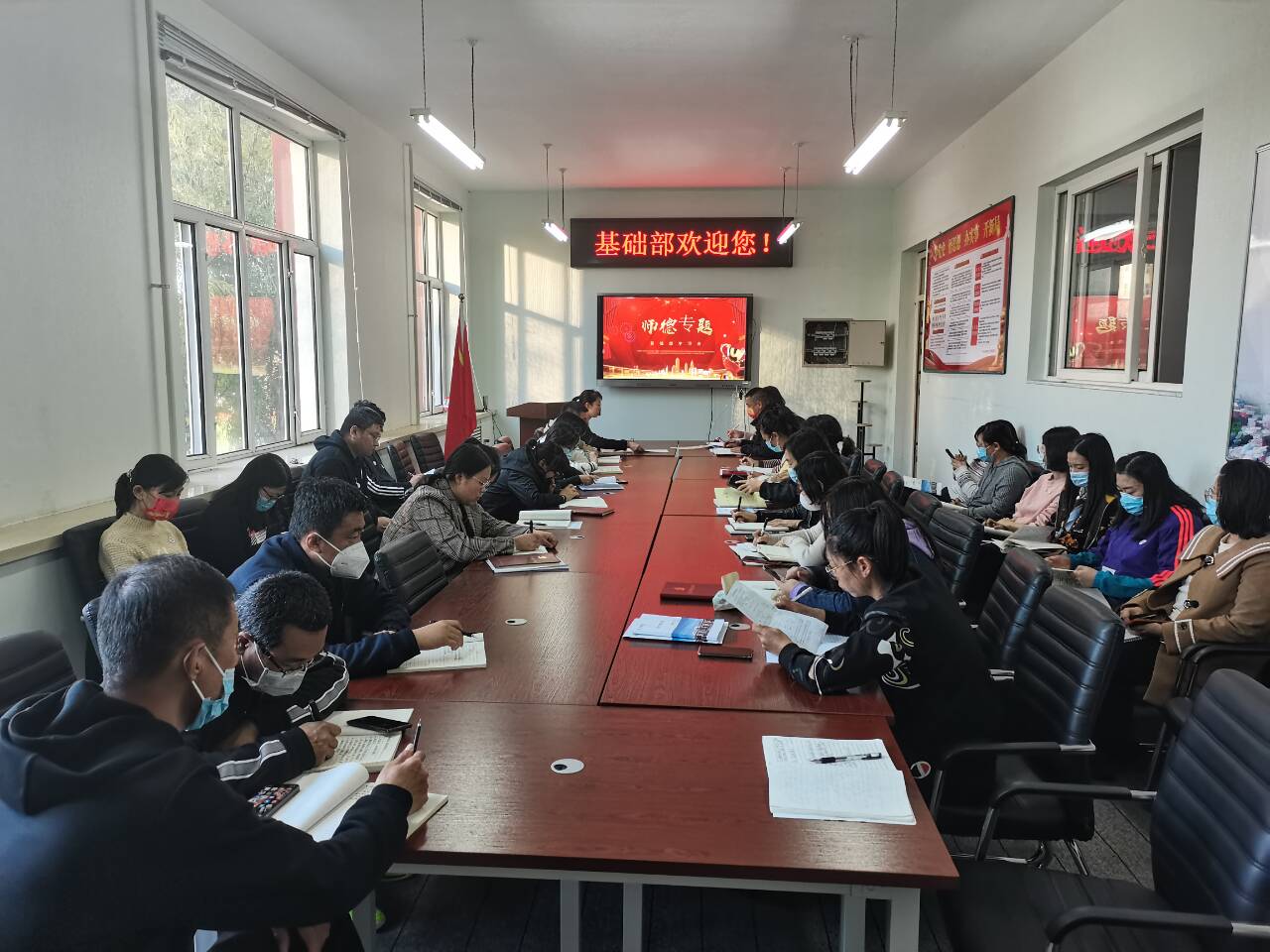 10月12日,基础部召开师德师风专题学习会议,基础部副主任冯洁主持会议,全体教师参加。