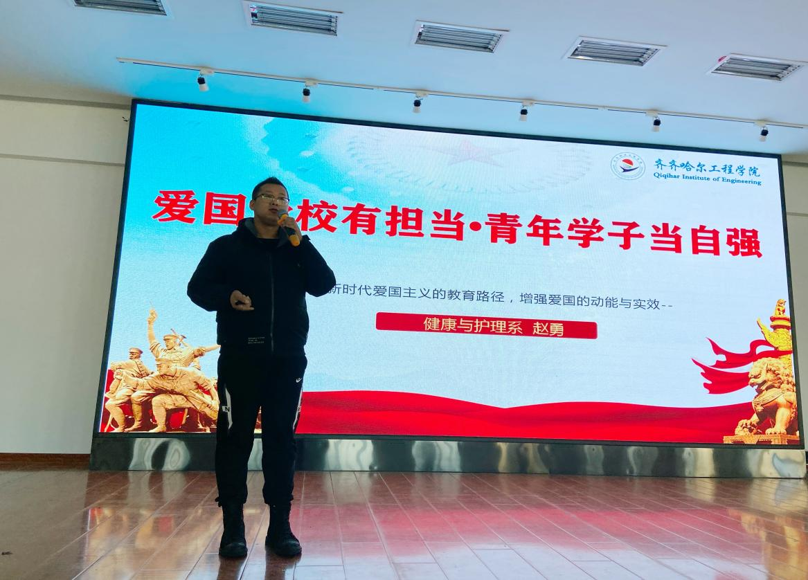 健康与护理系赵勇老师为学生讲述了爱国主义精神的内涵,从疆土、人民、文化三个层面,阐述了爱国不仅是一个公民应有的道德品质,更是中华民族的优良传统。他表示,朝代会变迁、历史会发展、时代会前行、制度会改变,但是在潮起潮落中始终不变的是一个民族经久不衰、生生不息的民族精神和爱国情怀。赵老师还通过图片,向学生展现了中华传统文化,要求学生要成为具有中国传统文化修养的公民。