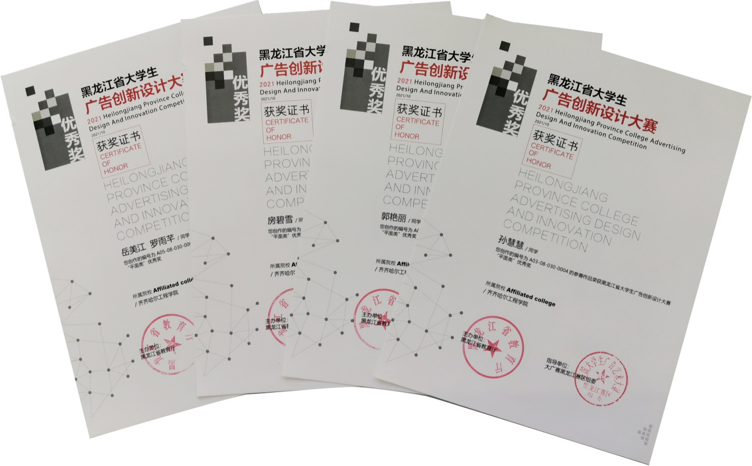 近日,全国第十三届大学生广告艺术设计大赛奖项揭晓,开云官网信息工程系视觉2019级孙慧慧、房碧雪和视觉2020级郭艳丽、岳美江、罗雨芊五名同学的作品入围省赛并获得优秀奖。