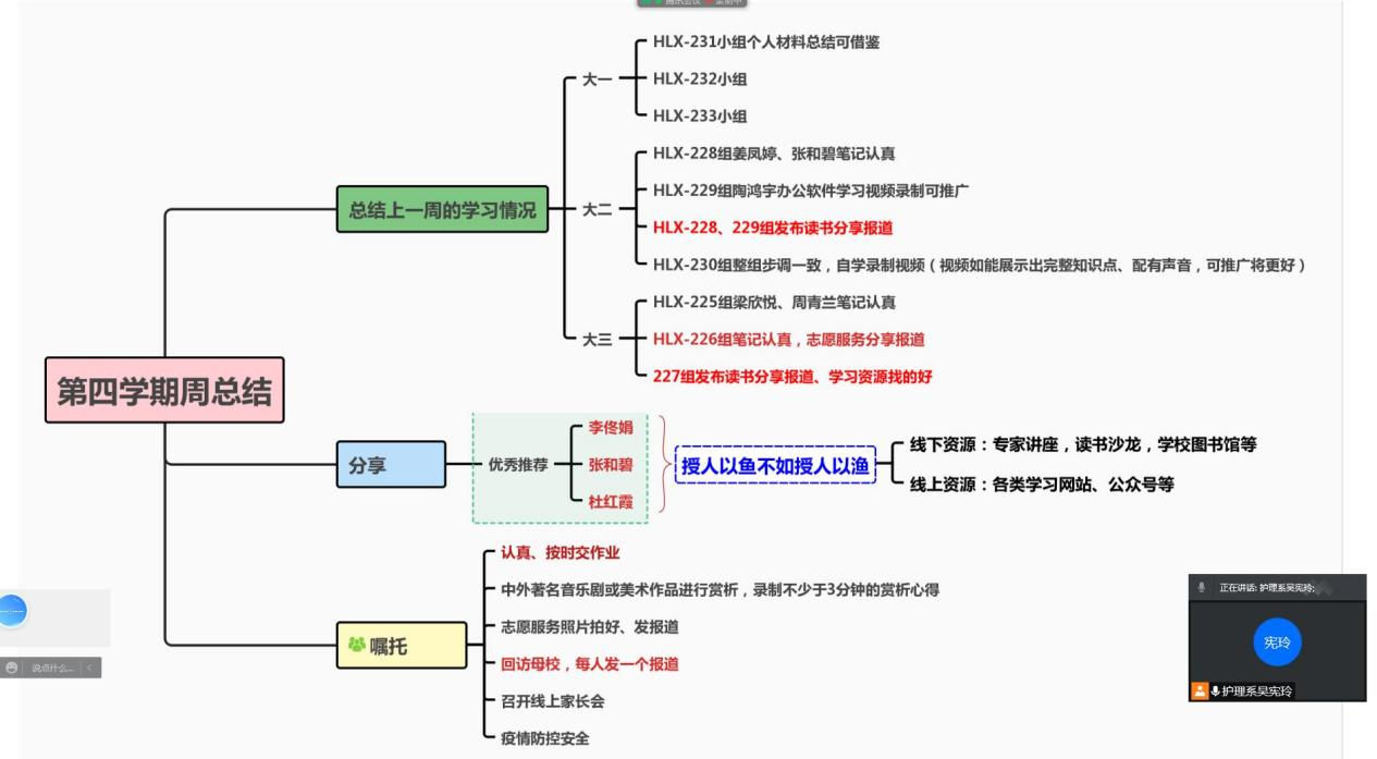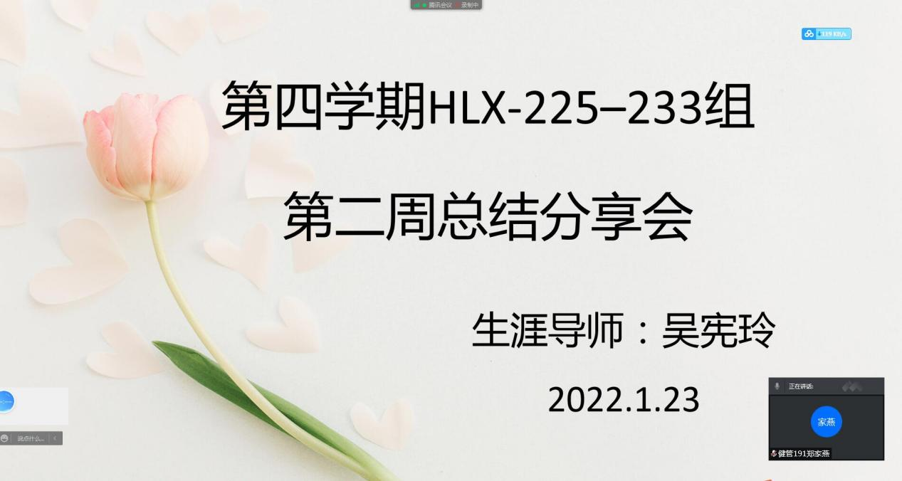 为了总结二周以来四学期开展情况,更好地指导学生完成第四学期实践任务,吴宪玲老师于1月23号下午在腾讯会议上开展了第四学期第二周社会实践成果交流分享会,参加此次会议的是健管专业HLX225—233组全体同学。