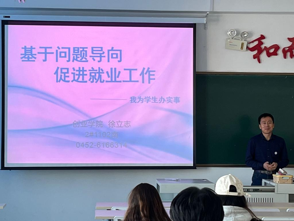 徐立志主要从解决急难愁盼问题、各地就业政策、常识性就业知识、报到证以及毕业生档案五个方面进行了讲解,让学生了解自己的优势和各地的就业政策,并讲解了如何签约三方协议、毕业后的档案派遣和档案的重要性等学生关心的问题,并祝愿同学们顺利毕业找到自己理想的职位。