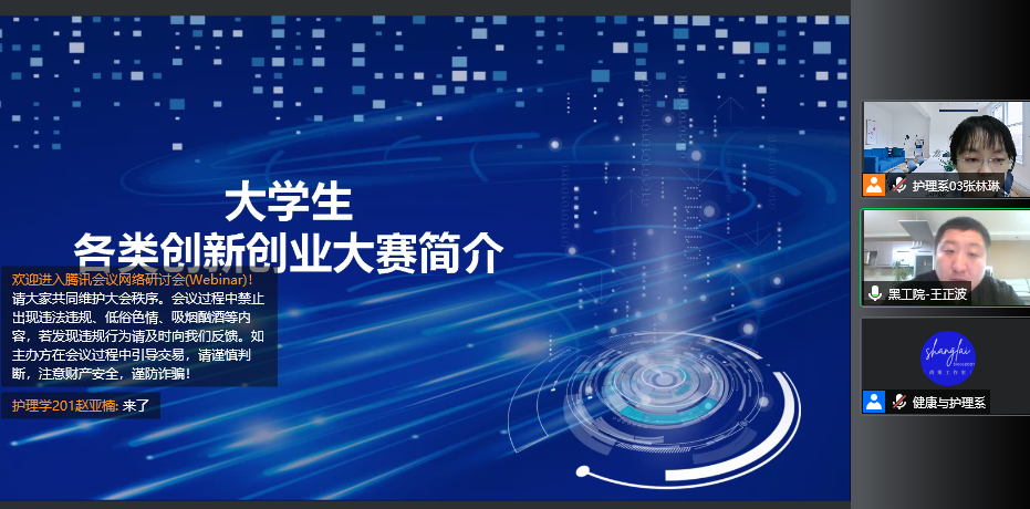 为激发大学生创新活力,增强创新创业意识,4月19日晚,护理学专业采用腾讯会议形式举办专创融合讲座,特邀请黑龙江工业学院现代制造工程学院副教授、高级工程师王正波主讲,专业全体师生参加。