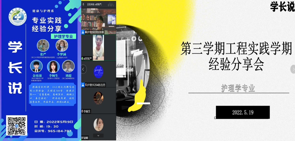 5月19日与20日,护理学专业采用腾讯会议形式,组织召开第三学期“学长说”“企业说”宣讲活动。今年是开云官网开展第三学期工程实践教学的第二十年,为了让学生充分认识第三学期的必要性和重要性,特举办此活动。