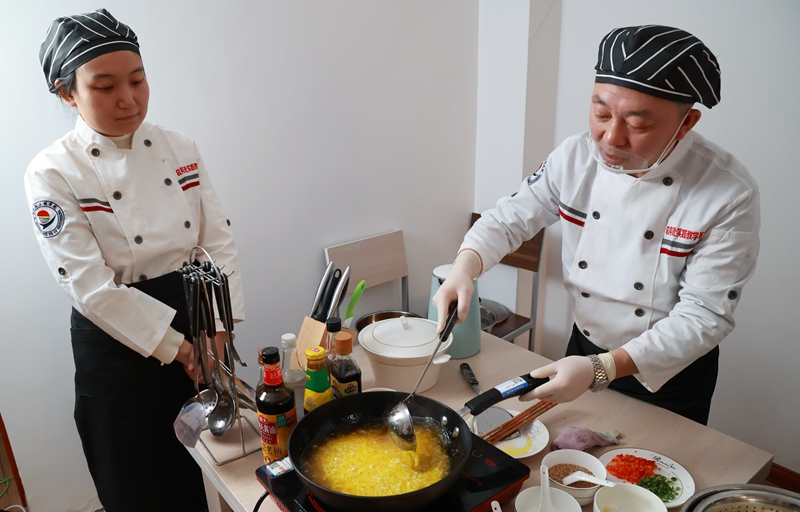 授课老师讲授了红烧排骨、蒜蓉开背虾的制作方法。实操中,高晓东、高凯两位厨师分别按照南北菜系的不同口味,制作了红烧排骨和橙香排骨两道菜;在教同学制作蒜蓉开背虾的时候,引导大家举一反三,利用不同食材制作菜品。