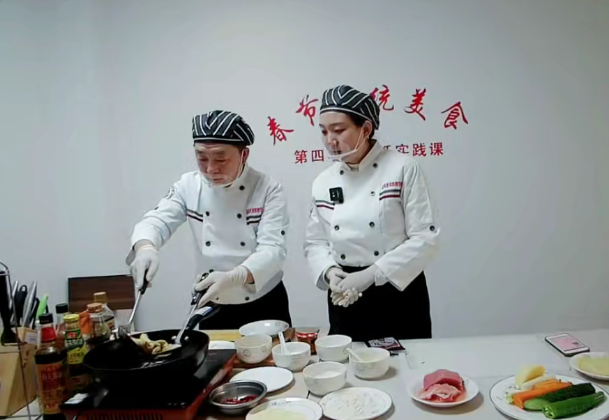 随后,授课老师讲授了春饼、春卷与京酱肉丝的制作方法。课堂实操中,授课老师演示了如何擀面、蒸饼,讲授火候控制;如何制作京酱肉丝,包括配菜、切丝、调汁;如何包红豆沙春卷,提示油炸过程的注意事项。授课中,老师与学生们时时互动,了解跟随学习情况,及时解答疑问,隔空手把手,线上零距离。