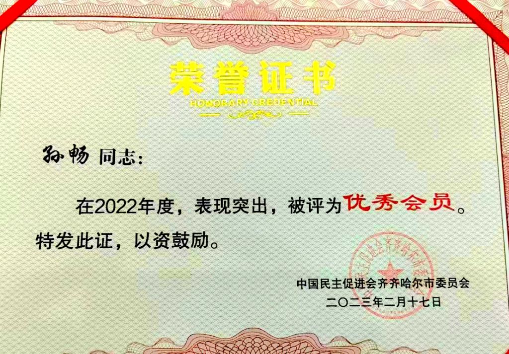 2月17日上午,民进市委召开2022年度总结表彰大会。民进齐市工程学院支部荣获“民进齐齐哈尔市2022年度先进基层组织”称号,民进齐市工程学院支部委员崔晓东、孙畅获“民进齐齐哈尔市2022年度优秀会员”称号。