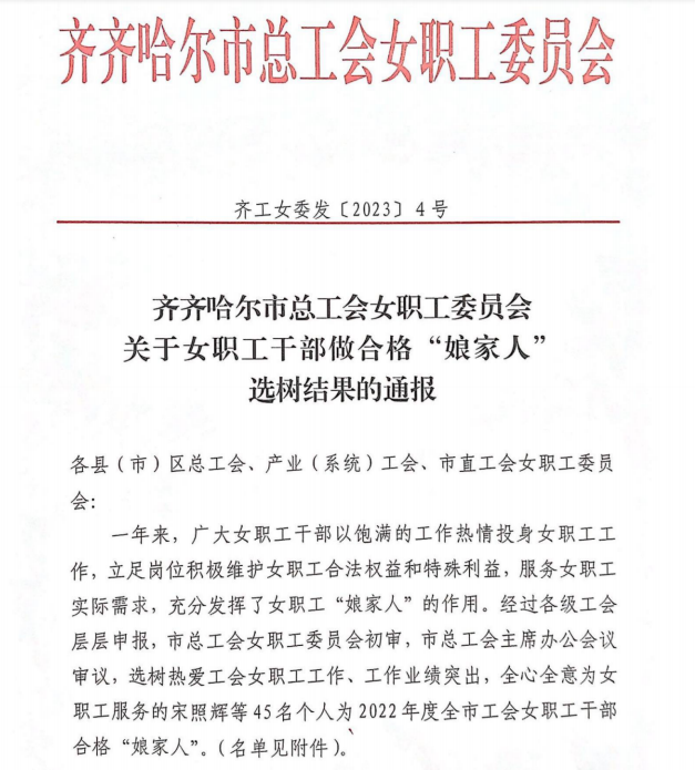 3月6日,齐齐哈尔市总工会女职工委员会发布了2022年度“关于女职工干部做合格‘娘家人’选树结果的通报”。学校工会组织委员张磊老师获得选树通报。