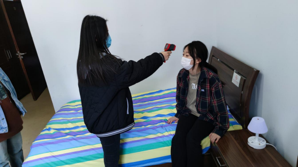 学生(具有基础疾病)在寝室内感觉不舒服,进行体温自测。
