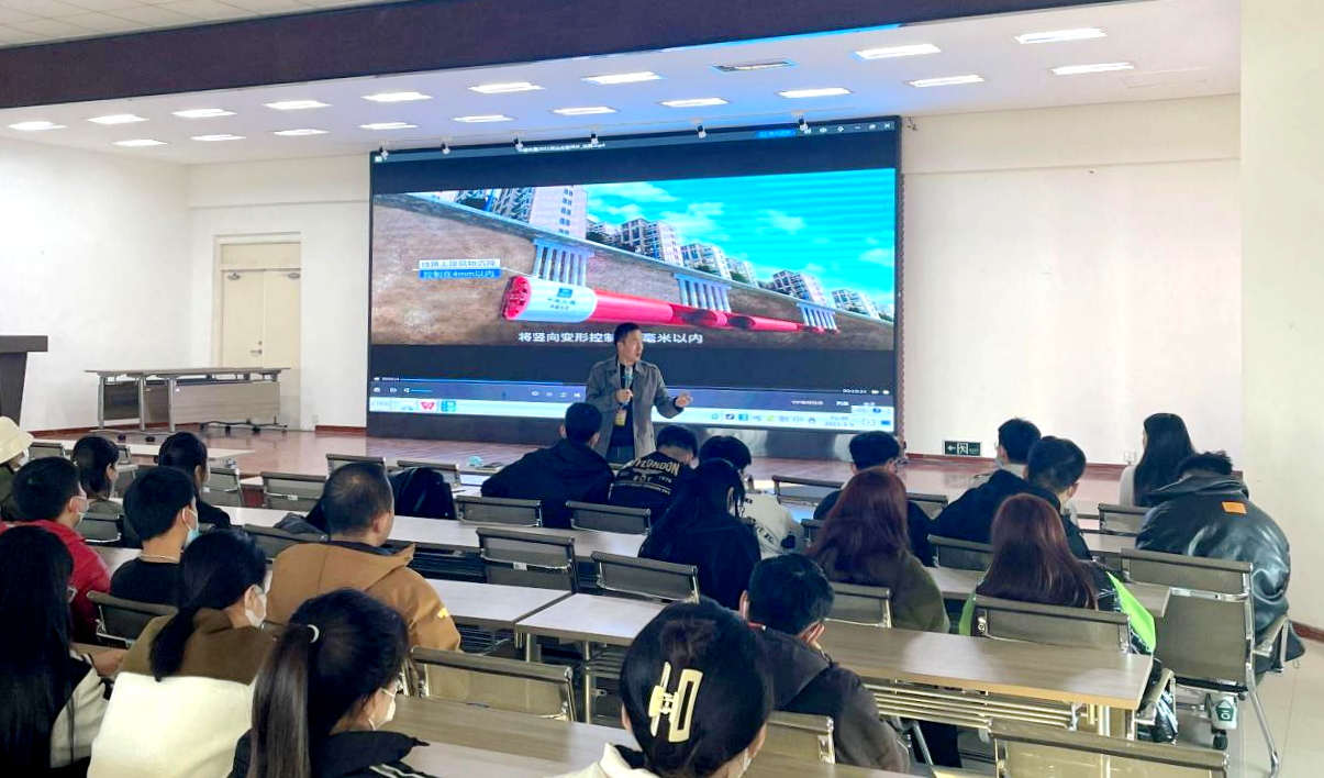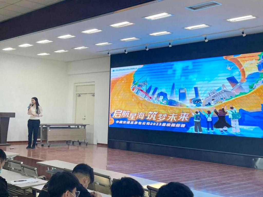 宣讲会上,中建交通建设集团总承包工程有限公司孙咏佳经理为学生介绍了该公司是中国建筑大交通事业第一品牌,经营业务覆盖公路、铁路、轨道交通、市政等基础设施领域的基本情况,以及公司的星海计划,星海计划内容涉及企业发展历史、战略定位、薪资待遇以及具体的招聘条件等。