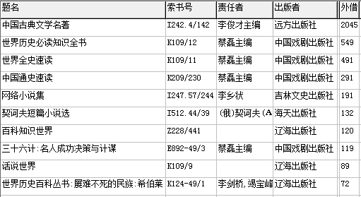 《中国古典文学名著》外借2045次,该文学名著为系列读物,多年来持续首位;《世界历史必读知识全书《世界全史速读》列第二位和第三位,借阅量分别是549次和491次。根据图书借阅数据综合分析:榜单中有1/2是索书号为K的历史、地理类图书,2/5是中国戏剧出版社蔡磊主编的系列丛书,说明读者对历史、地理类及系列丛书阅览需求极高有三本是文学类图书,已连续三年上榜,可以看出读者对文学类图书由衷热爱,阅读热度持续增长索书号为Z类的综合性图书《百科知识世界》三年来持续在榜,今年名次有所下滑,值得关注的是,本年度索书号为E军事类图书《三十六计:名人成功决策与计谋》跃进第七名且借阅数超过一百近五年内为首次,可见随着时代的发展读者对军事类图书开始关注。通过阅读先贤的智慧决策与计谋来学习谋篇布局,因各系专业对学生课外读物都有一定的建议,每期图书荐读也有不同的主题学生购书学校报销的政策也给广大读者更多自主选择的方向,有助于阅读目的性与自我素质提升相结合,展现了以学生为中心的基本理念