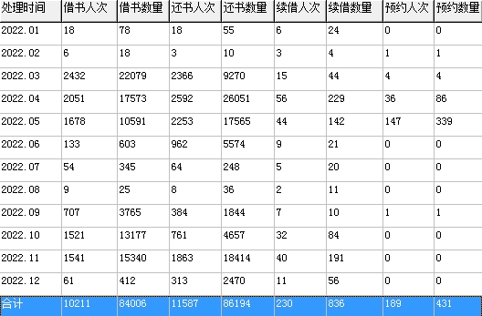 2022年,图书馆充分调研师生实际阅读需求,开通多种资源推荐方式,以需求为导向,优化馆藏资源配置,并在疫情防控常态化的形势下,积极开展线上线下服务,落实服务育人。整体文献资源利用率得以大幅提升,相关数据如下表