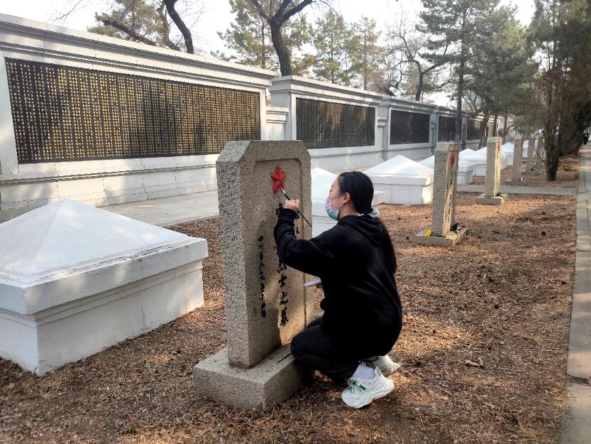 到达西满革命烈士陵园后,动画专业学生先为烈士墓碑拭去灰尘,并对刻字及雕刻补色。