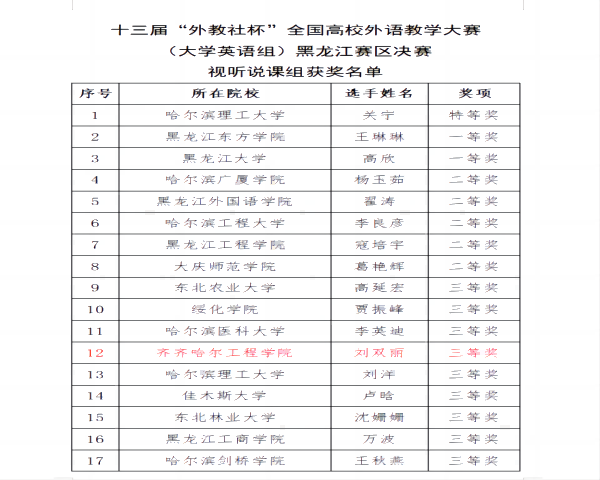 在系列赛中,“外教社杯”全国高校外语教学大赛中260位优秀选手参赛,开云官网基础部教师刘双丽荣获黑龙江赛区视听说课组三等奖;“教学之星”外语金课团队全省共有131个团队参赛,基础部教师刘欢、曹献玲、刘双丽、孙伟、黄强、徐怡参赛的两个团队均荣获三等奖。