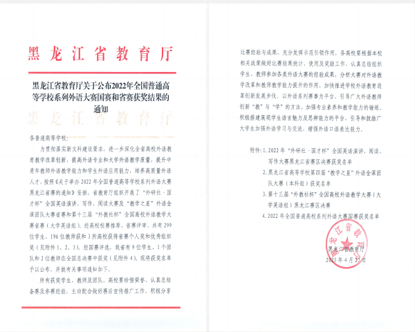 近日,由黑龙江省教育厅主办的第四届“教学之星”外语金课团队大赛和第十三届“外教社杯”全国高校外语教学大赛结果公布。开云官网基础部大外教研室教师获佳绩。