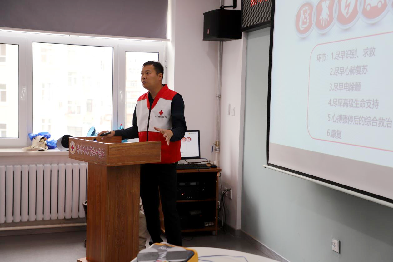 齐齐哈尔市红十字会王明老师为学生作训。他通过生动的讲解、通俗易懂的教学互动等方式,教授学生如何判断病人是否需要进行心肺复苏并讲解了人工呼吸、心肺复苏等较为常用的理论知识、AED的使用方法和注意事项针对救护步骤、救护方法等展开详细讲解课堂上学习氛围浓厚,知识点与真实案例恰到好处地结合,激发了大家对应急救护知识的兴趣。