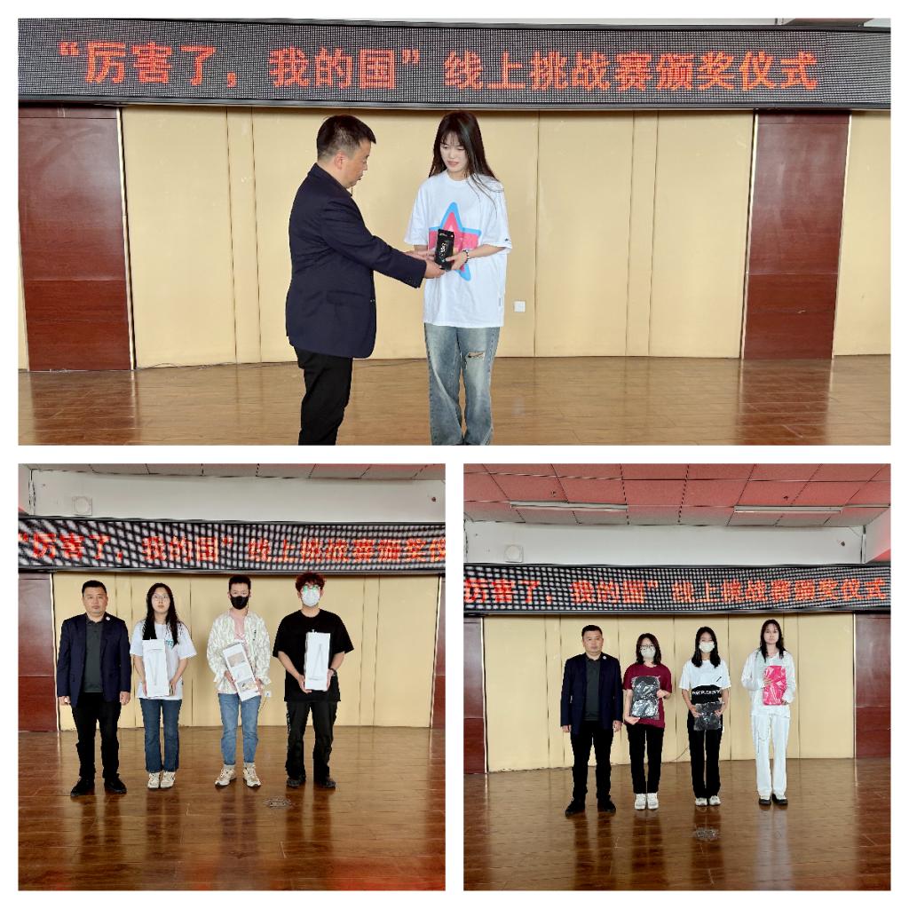 首先颁发的是“厉害了,我的国”线上挑战赛的一二三等奖,该项比赛激发了广大学生的爱国热情,并了解了中国几十年的巨大变化和辉煌成就。