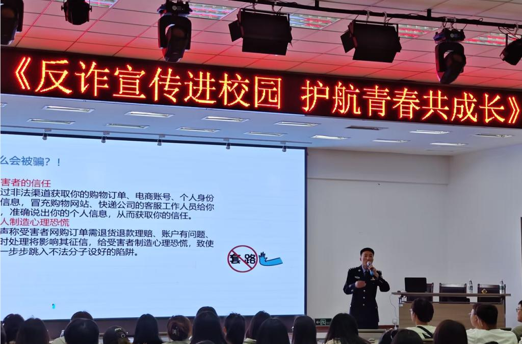 “反诈宣传进校园 护航青春共成长”主题宣讲中,樊心亮民警结合真实事例,将电信网络诈骗常用手段与日常预防等内容,用通俗易懂的语言讲给学生,并向学生揭露了刷单返利,以及冒充电商物流客服、虚假购物服务、电子游戏充值刷单等高发电信诈骗案件的犯罪特点。