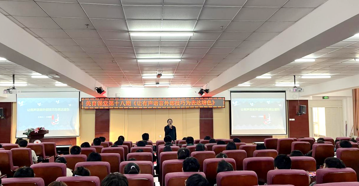 5月17日晚,王巍巍老师在图书馆501报告厅开办第十八期美育课堂,讲授“让有声语言外部技巧为表达增色”的知识,使同学们了解到有声语言的要求,掌握有声语言中停顿技巧,充分表达朗读者的思想情感,并学会补气的方法,如“偷气、抢气、就气”,体会声音的魅力。