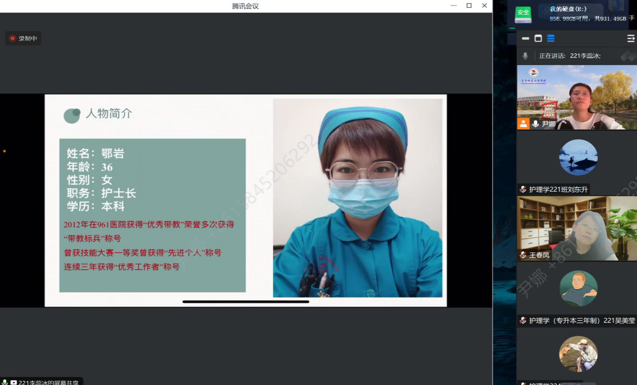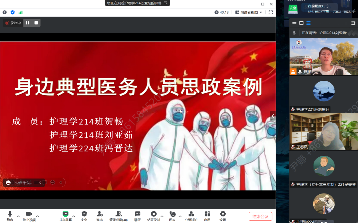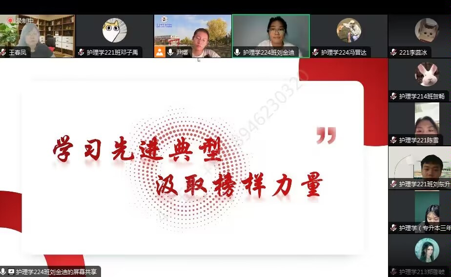 7月21日晚,为学习先进典型,更好地践行专业实践学期实习,健康与护理系仲泰医院实习组在线召开“学习先进典型 汲取榜样力量”典型医务人员思政案例汇报大赛。指导教师及全体实习学生参加,专业教师尹娜、基础部大学语文教师王春凤担任本次比赛评委,护理学224班刘金迪主持。