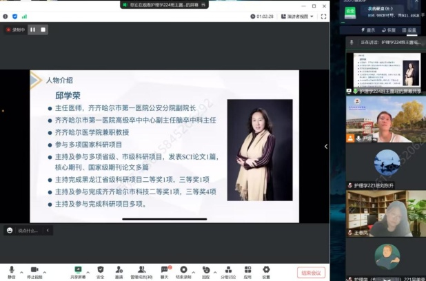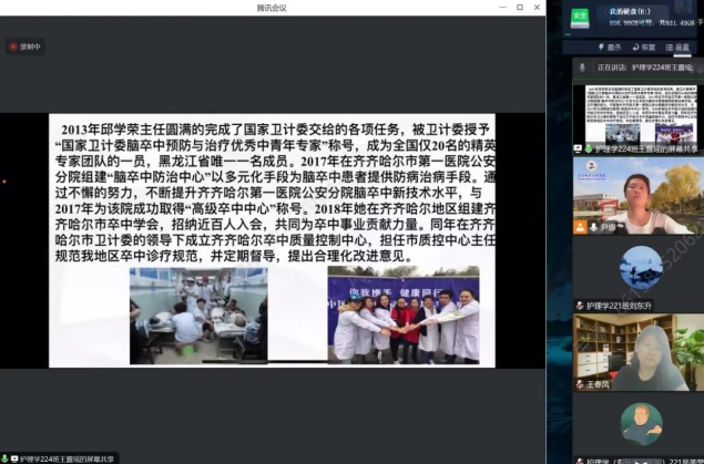 第五组郑彭岐同学介绍仲泰医院康复科主任邱学荣,分享邱主任自费参加国内各种脑血管病学术会议,不断学习研究;率先开展静脉溶栓治疗,填补了齐市地区缺血性脑血管治疗的一项空白;组建齐齐哈尔卒中学会的经历。体现了医务人员坚持学习,不断进行专业领域知识和技能的提升,为患者提供高质量的医疗服务。