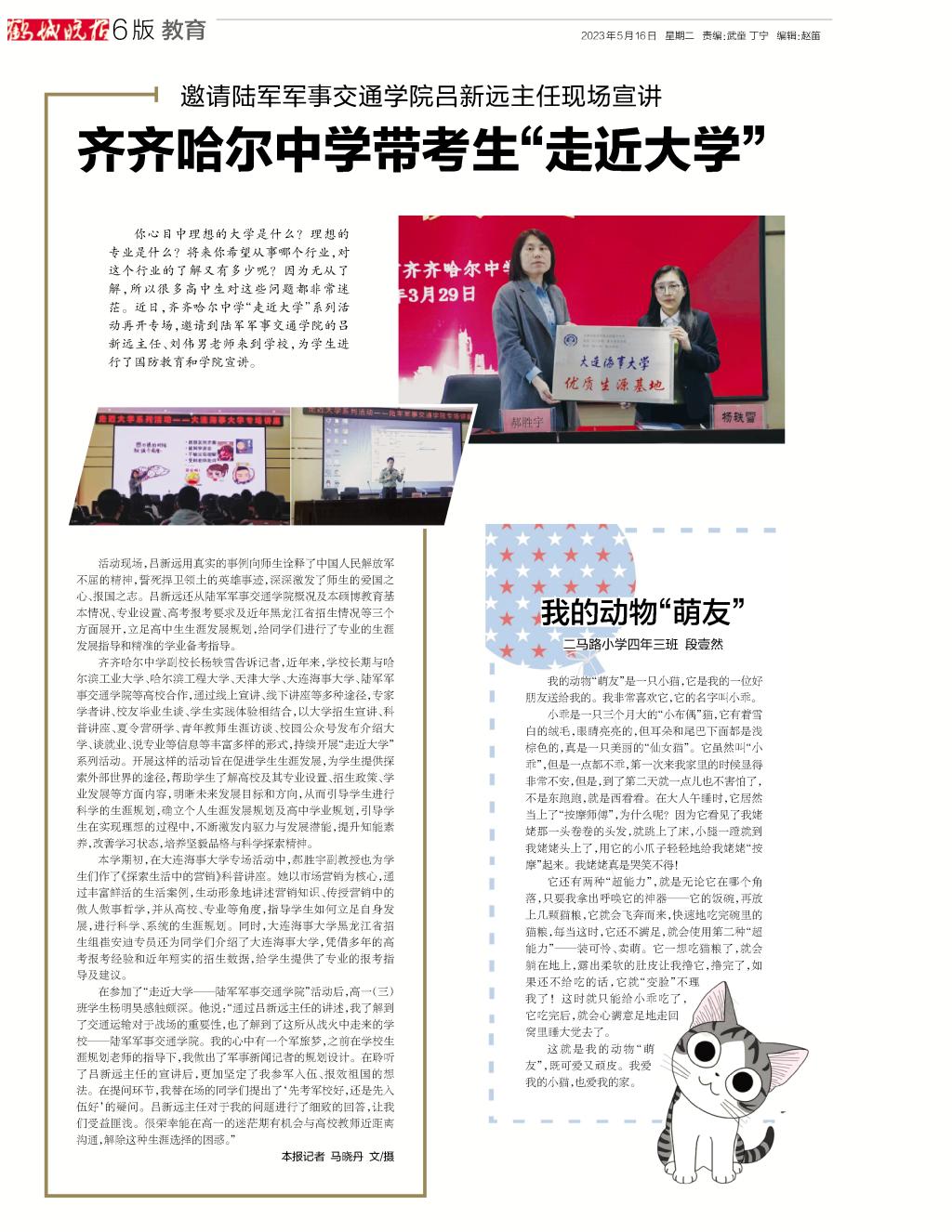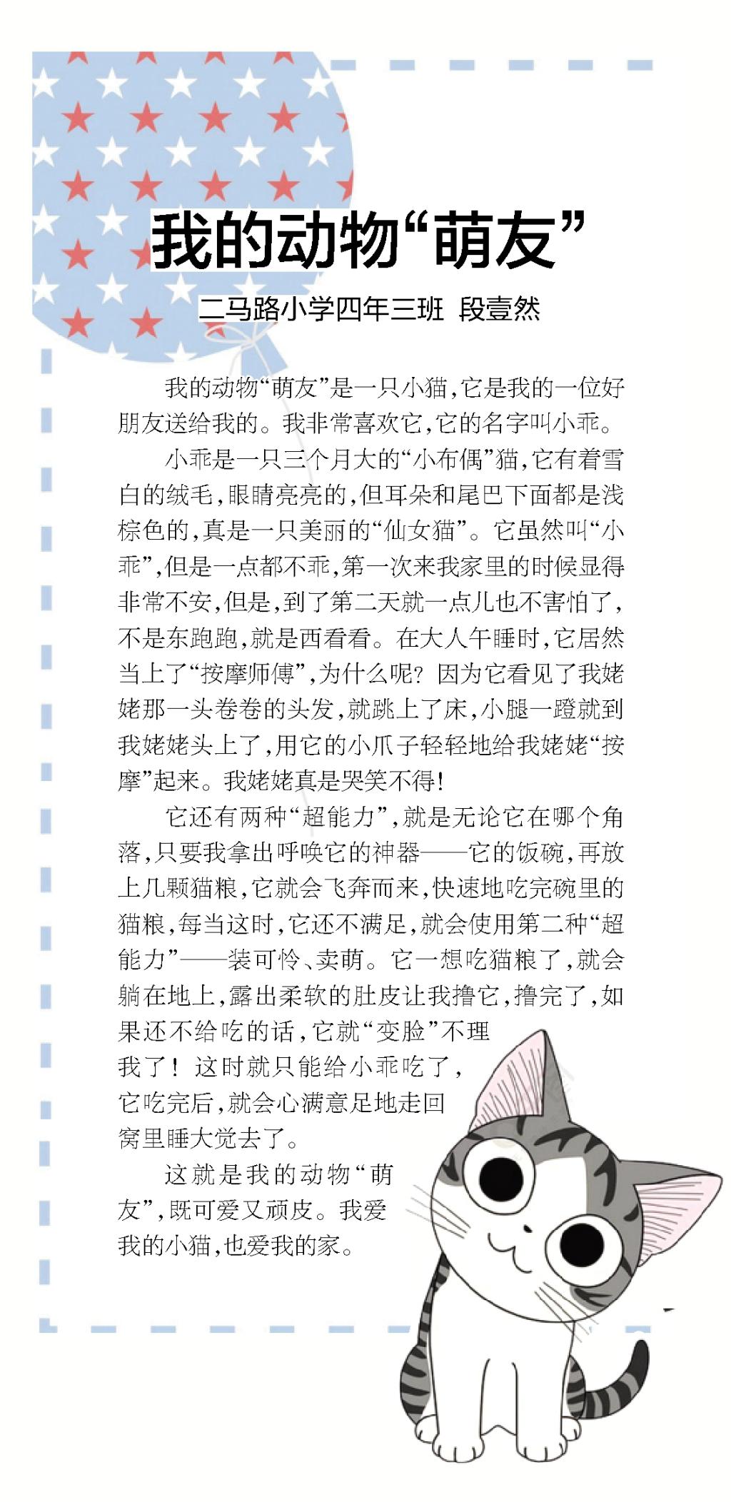 鹤城晚报发表子弟学校学生作文《我的动物“萌友”》