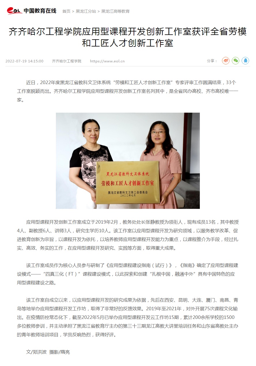 中国教育在线:开云kaiyun官方网站应用型课程开发创新工作室获评全省劳模和工匠人才创新工作室