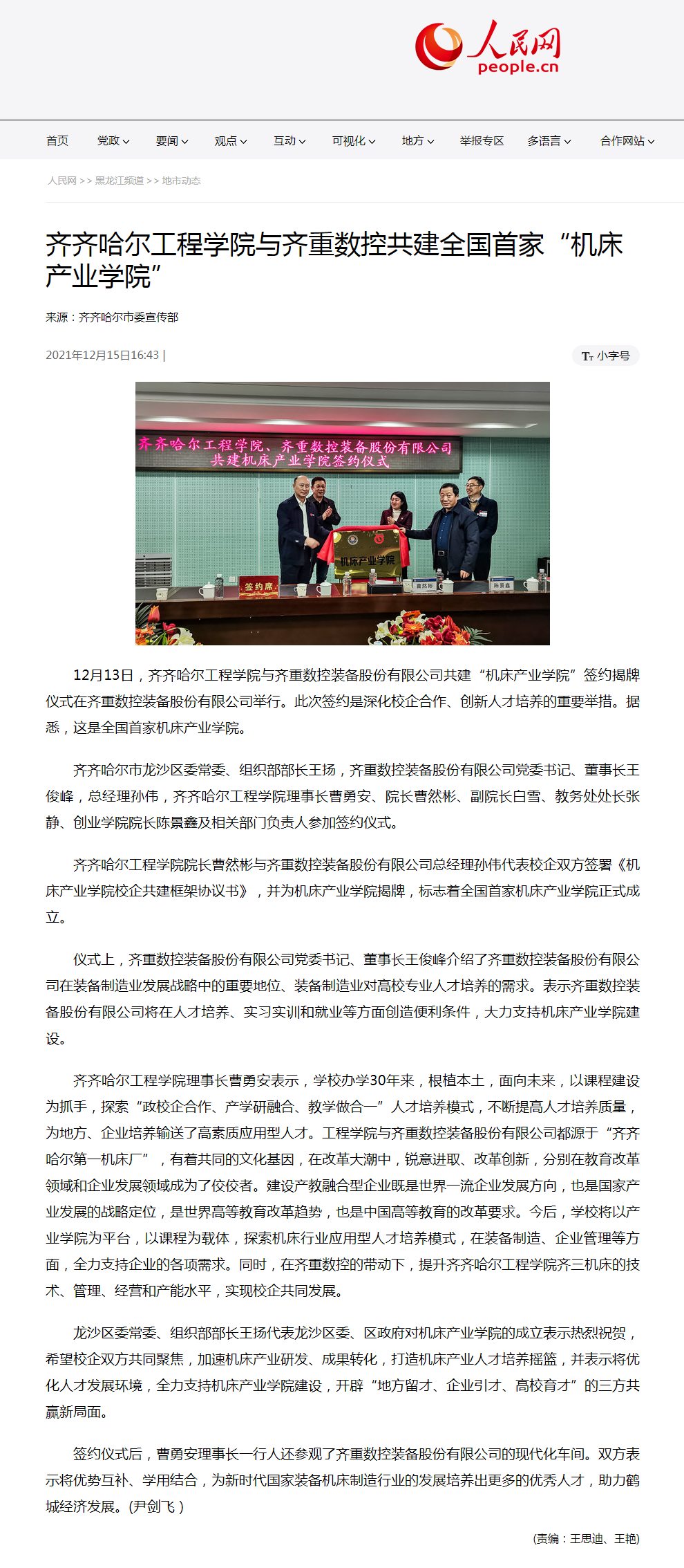 人民网:开云kaiyun官方网站与齐重数控共建全国首家“机床产业学院”