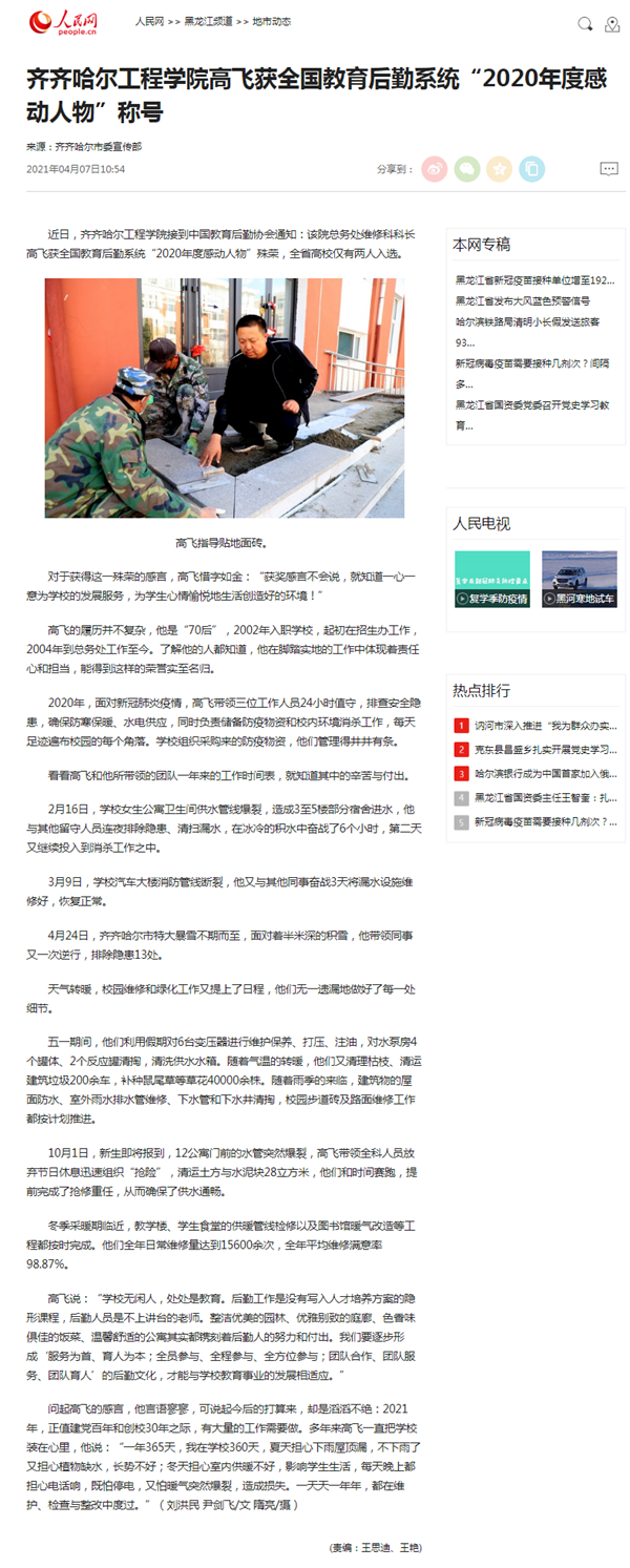人民网:开云kaiyun官方网站高飞获全国教育后勤系统“2020年度感动人物”称号