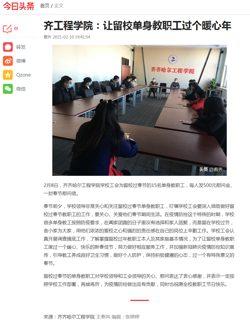 今日头条:齐工程学院:让留校单身教职工过个暖心年